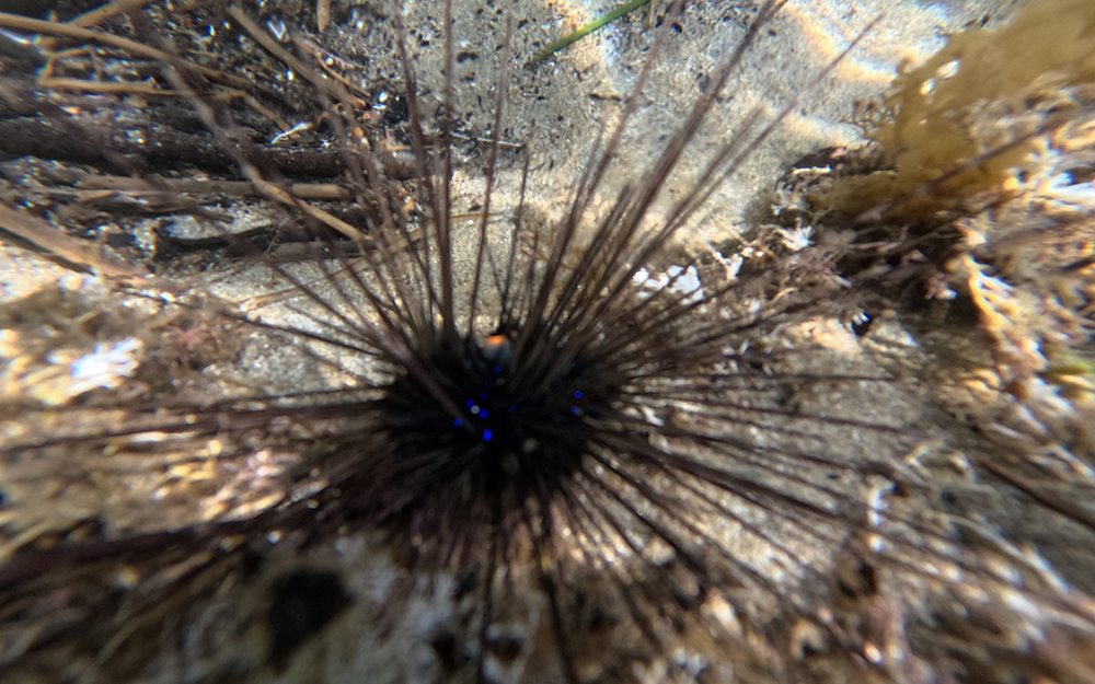 ただし、ガンガゼの棘にはムラサキウニとは違うある特徴があります。それは「細くて鋭い」ことです。ムラサキウニの棘は10cm程度で、踏み抜いたりしなければ、手で触る程度では刺さることは、ほぼほぼあり得ません。ガンガゼの場合は棘が30cm程度と細くて長いため少し触れただけでも刺さりやすいです。しかも、毒を持ち、意外と脆いということで皮膚に刺さると体内に残りやすいです。