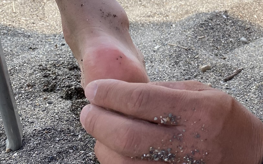 ムラサキウニは、棘先は丸いものの棘(とげ)に覆われていて、踏んだりすると、鋭い痛みを伴う刺し傷が生じます。棘は皮膚内部で砕けて、取り除かなければ慢性的な痛みや炎症を起こします。