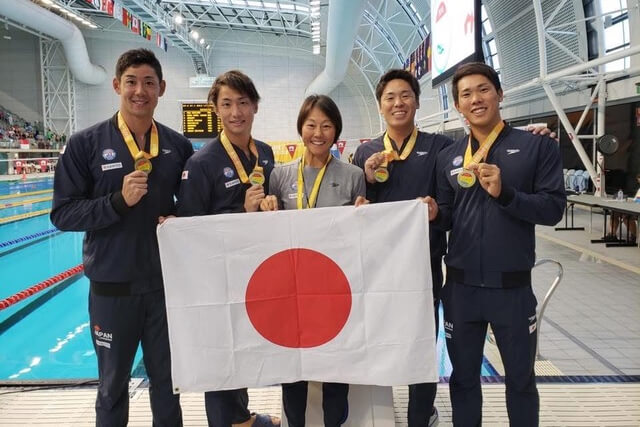 大学時代はプールインカレで3連覇・5冠などを達成し、学生インカレや九十九里LSCとして創設初の全日本総合優勝を達成。大学3年にはオープン日本代表として国際大会に初出場。大学4年では世界選手権にも出場し、団体種目で世界一となり、世界の頂点で君が代を聞いた経験は自分の人生にとって大きな財産となりました。